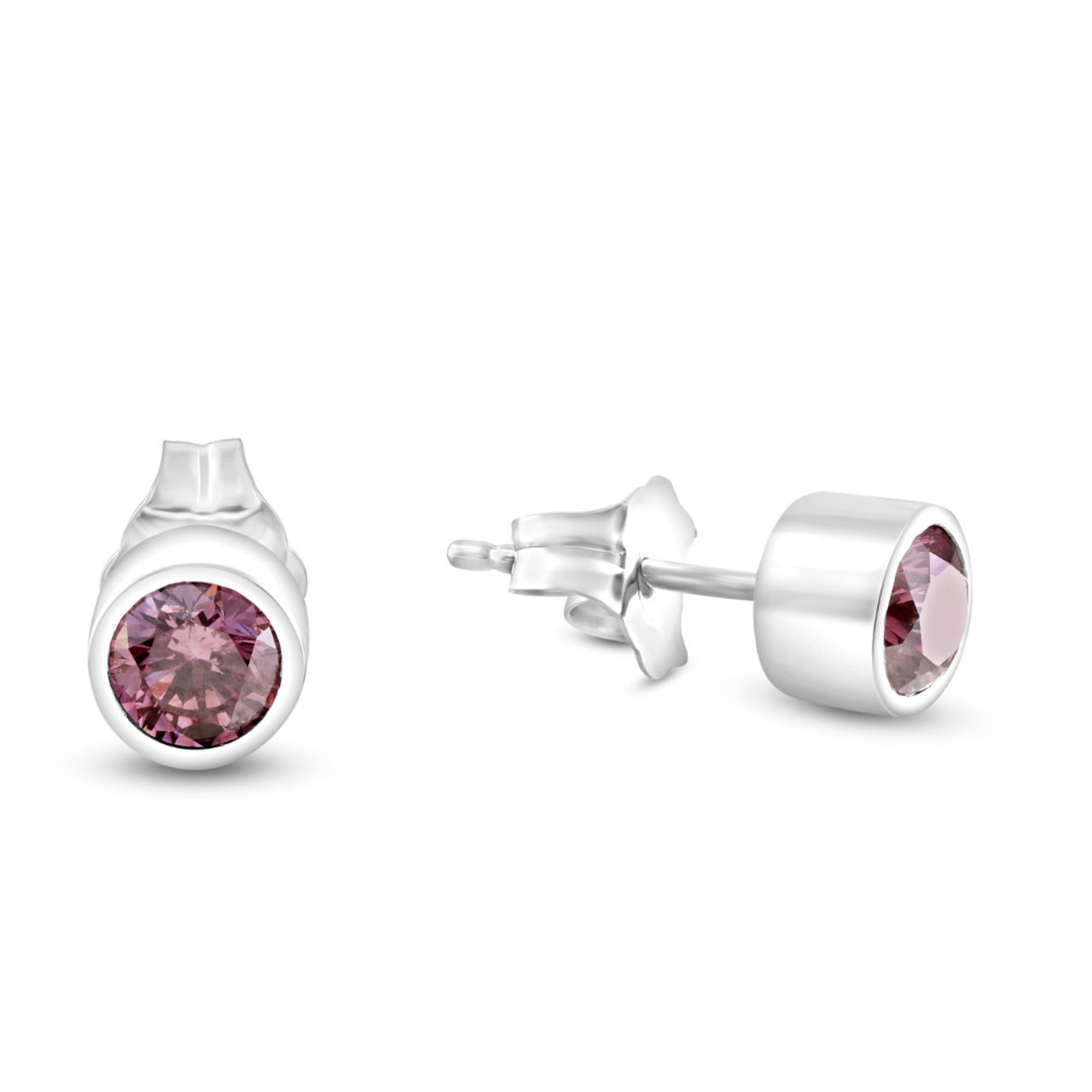 This fashionable pair of women’s studs features two round brilliant cut pink lab grown diamonds.The diamonds are bezel set in solid 14k white gold polished mountings with push backs.