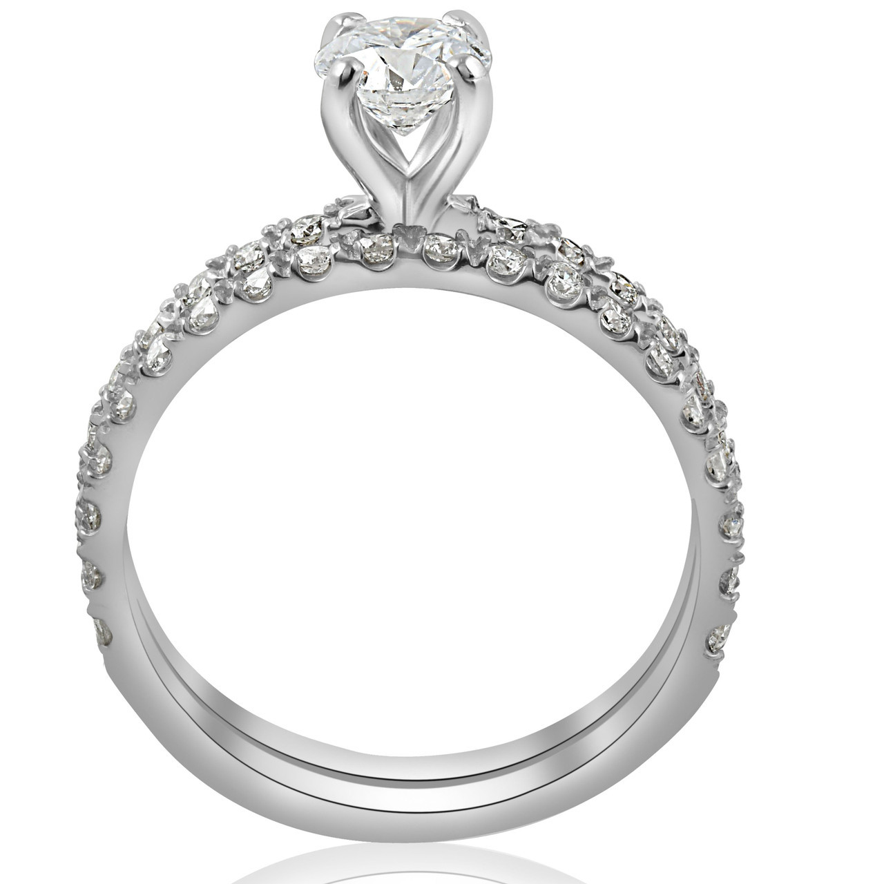 Womens engagement ring set features a 1/3ct round brilliant cut genuine diamond and 38 round brilliant cut diamonds.All diamonds are french pave set in solid 14k white gold high polished settings.Matching diamond wedding ring is included.This set is classic, sleek, and one to be loved forever and always.