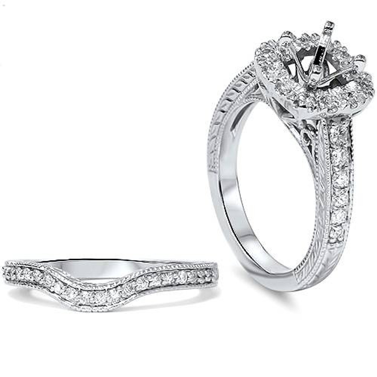 This engagement semi mount and matching wedding band features 44 round brilliant cut natural diamonds. We can supply round or square prongs for stones up to 1ct.