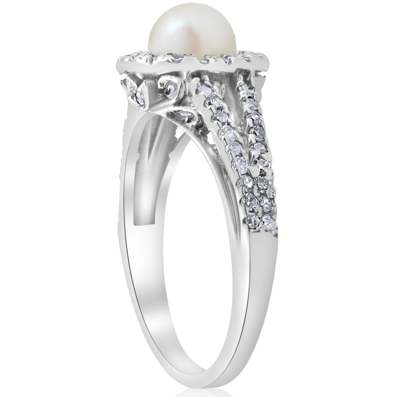 This womens ring features a 5mm genuine pearl and 59 round cut diamond. All stones are set in solid 14k white gold.